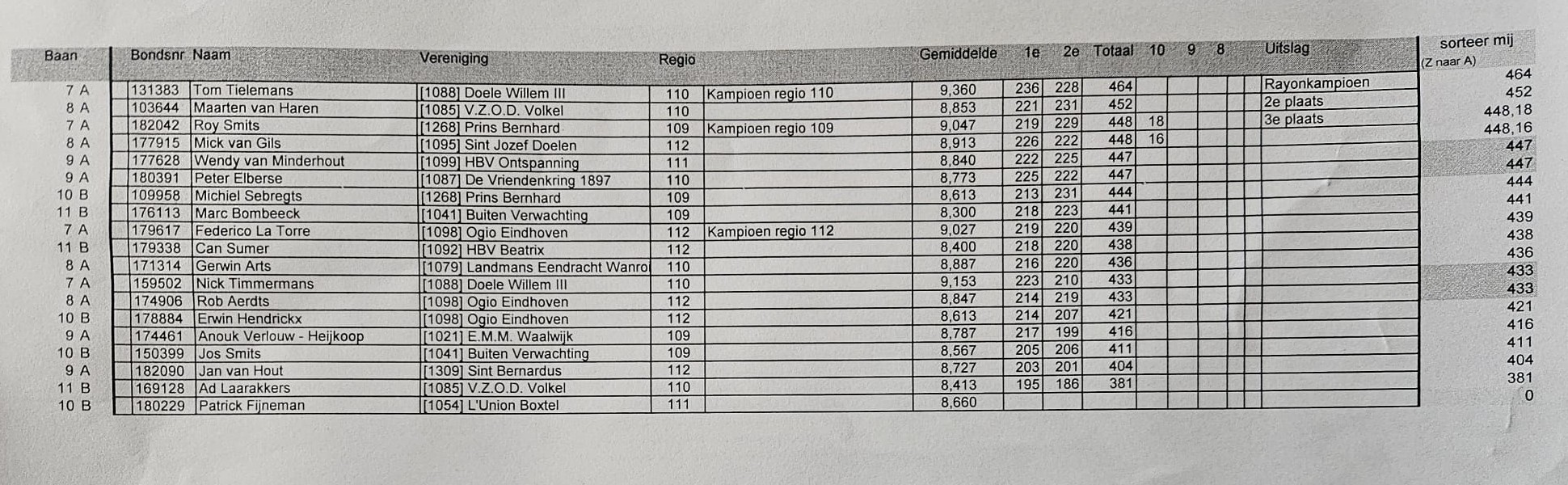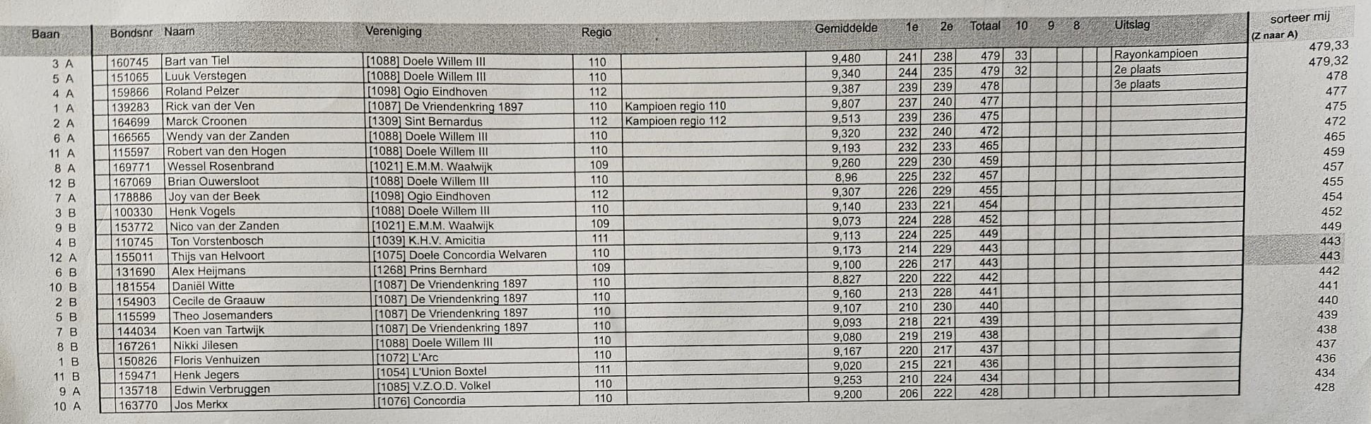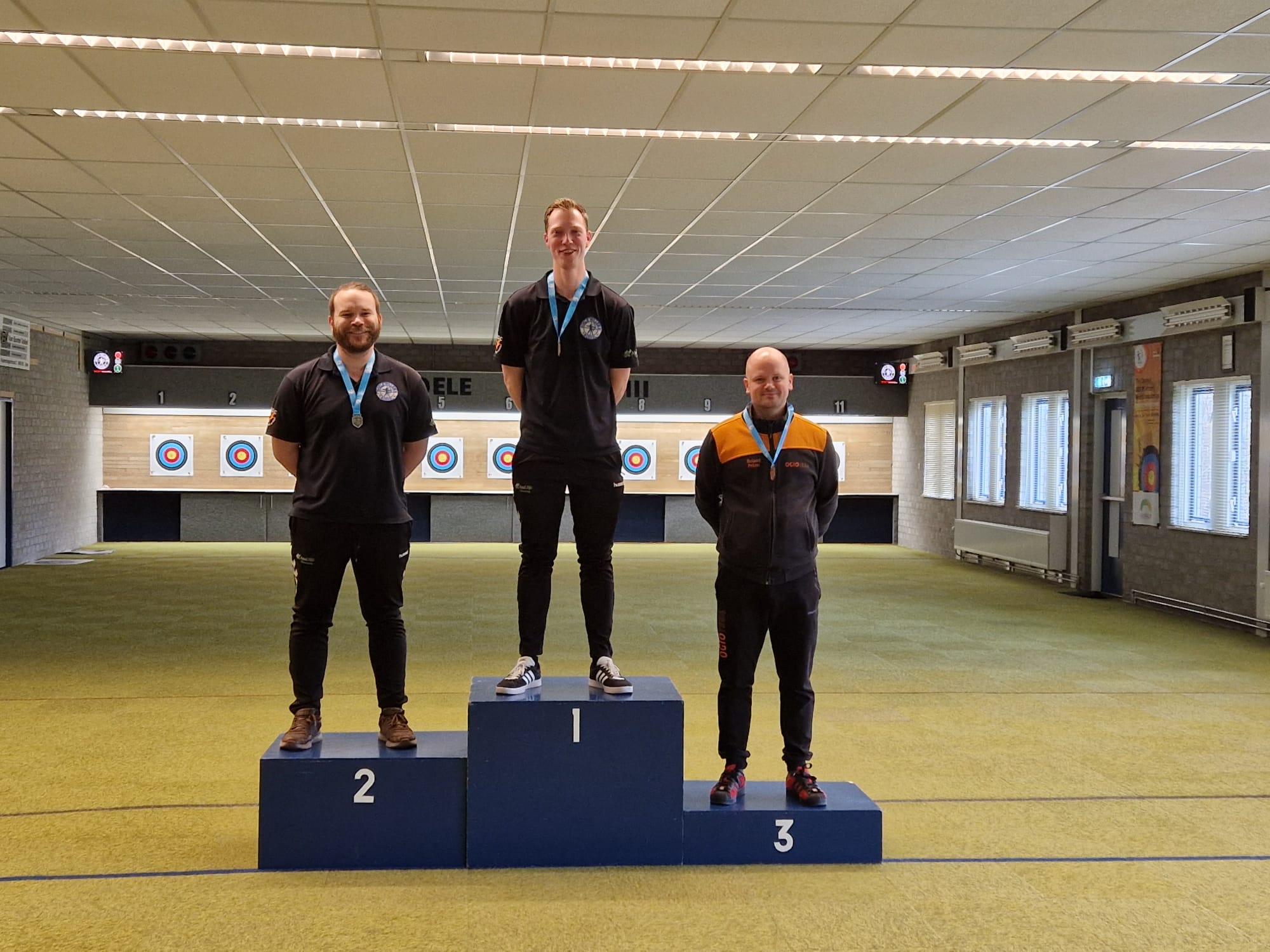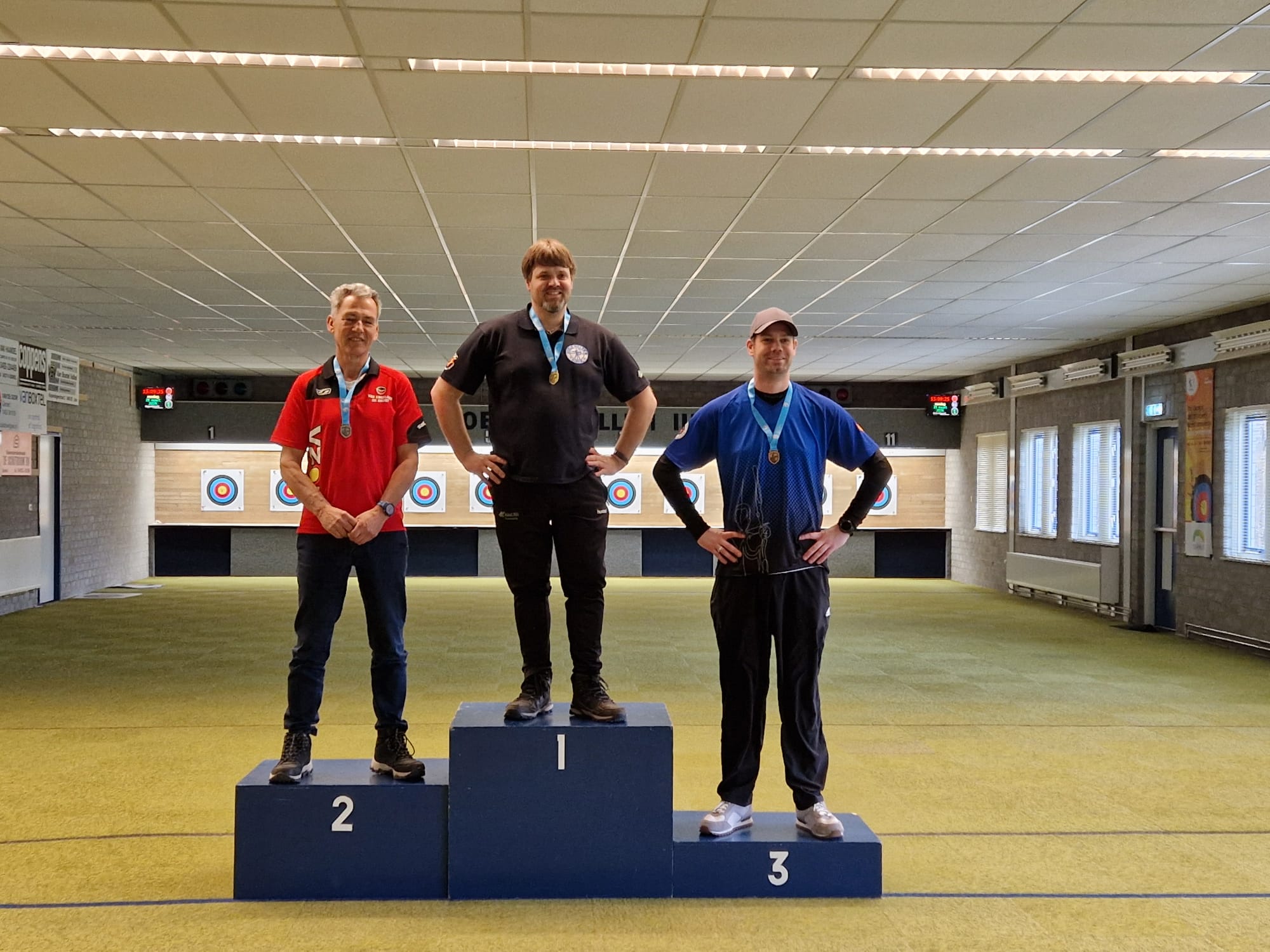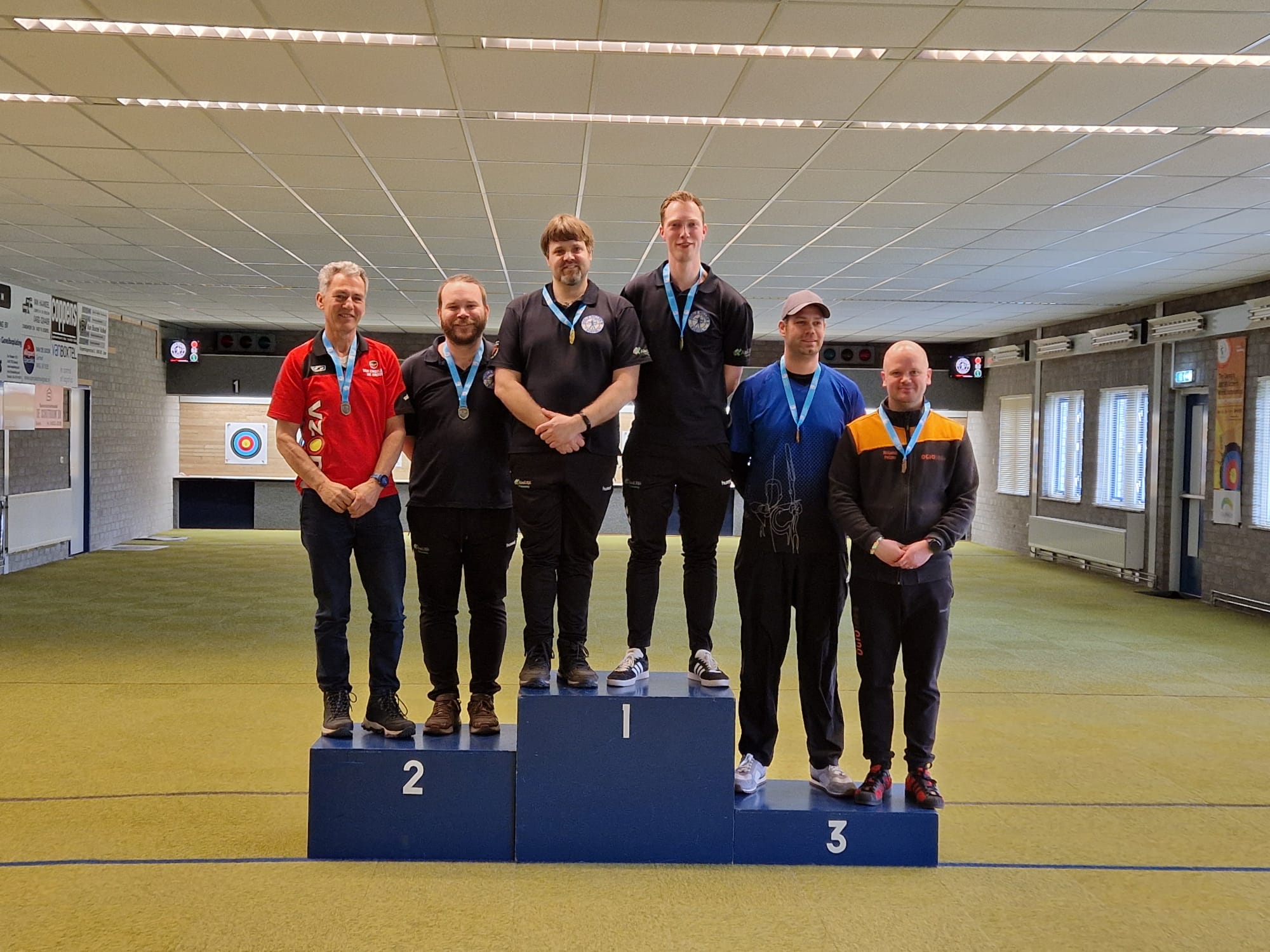 De eerste klasse kende een spannende strijd tussen maar liefst 24 schutters, waaronder twee van onze eigen toppers. Bart van Tiel en Luuk Verstegen schoten beiden een sterke score van 479 punten. Uiteindelijk gaf één extra tien de doorslag, waardoor Bart van Tiel de overwinning mee naar huis nam.
